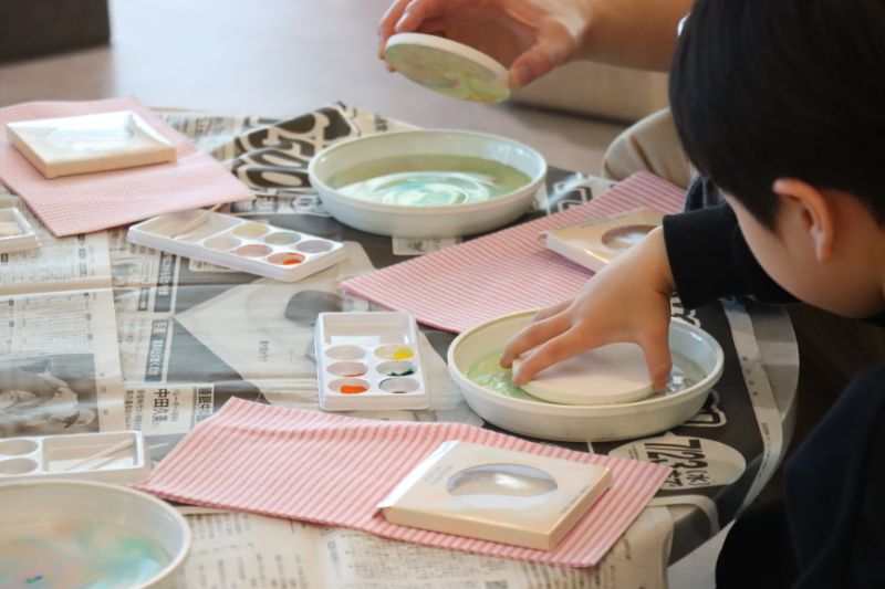 ワークショップでは、水に絵の具を浮かべて模様を作る「マーブリングコースター」づくりを中心に構成しました。水の性質を活かした創作工程の中で、子どもたちは色の置き方や道具の使い方を自ら工夫しながら取り組むことができ、水そのものへの関心が高まるよう設計しています。
