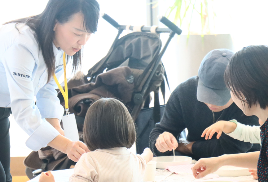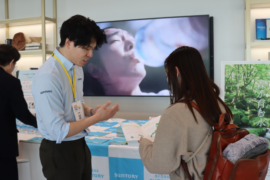その後のサントリーブースでは、初めて取り組みを知ったというワークショップ参加者が立ち寄り、活動の背景や取り組み内容の説明に、熱心に耳を傾けていました。