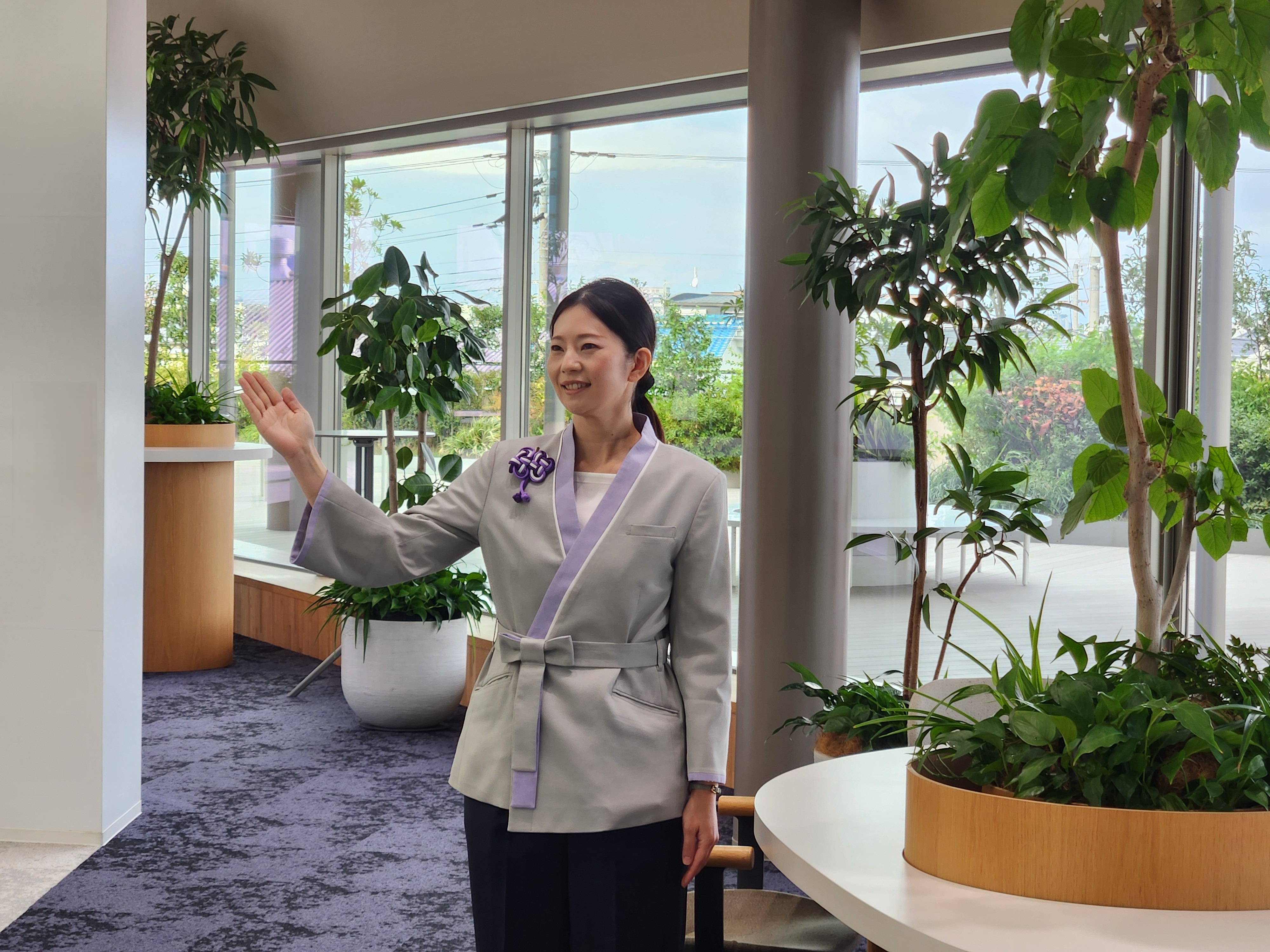 私は、ガイドツアーでの館内のご案内やインフォメーションカウンターでの受付対応をはじめ、研修で使用する機器の接続サポートなど、来館されるお客様が快適に過ごせるよう幅広いサポートを行っています。