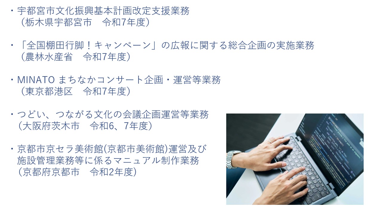 SPSの業務支援は、計画策定支援、調査、広報、人財育成、文化・芸術活動支援、文化事業の企画運営など多岐にわたります。文化・芸術の現場で培った多角的な視点と実践知を活かし、自治体や施設の課題に応じた最適な支援を行います。